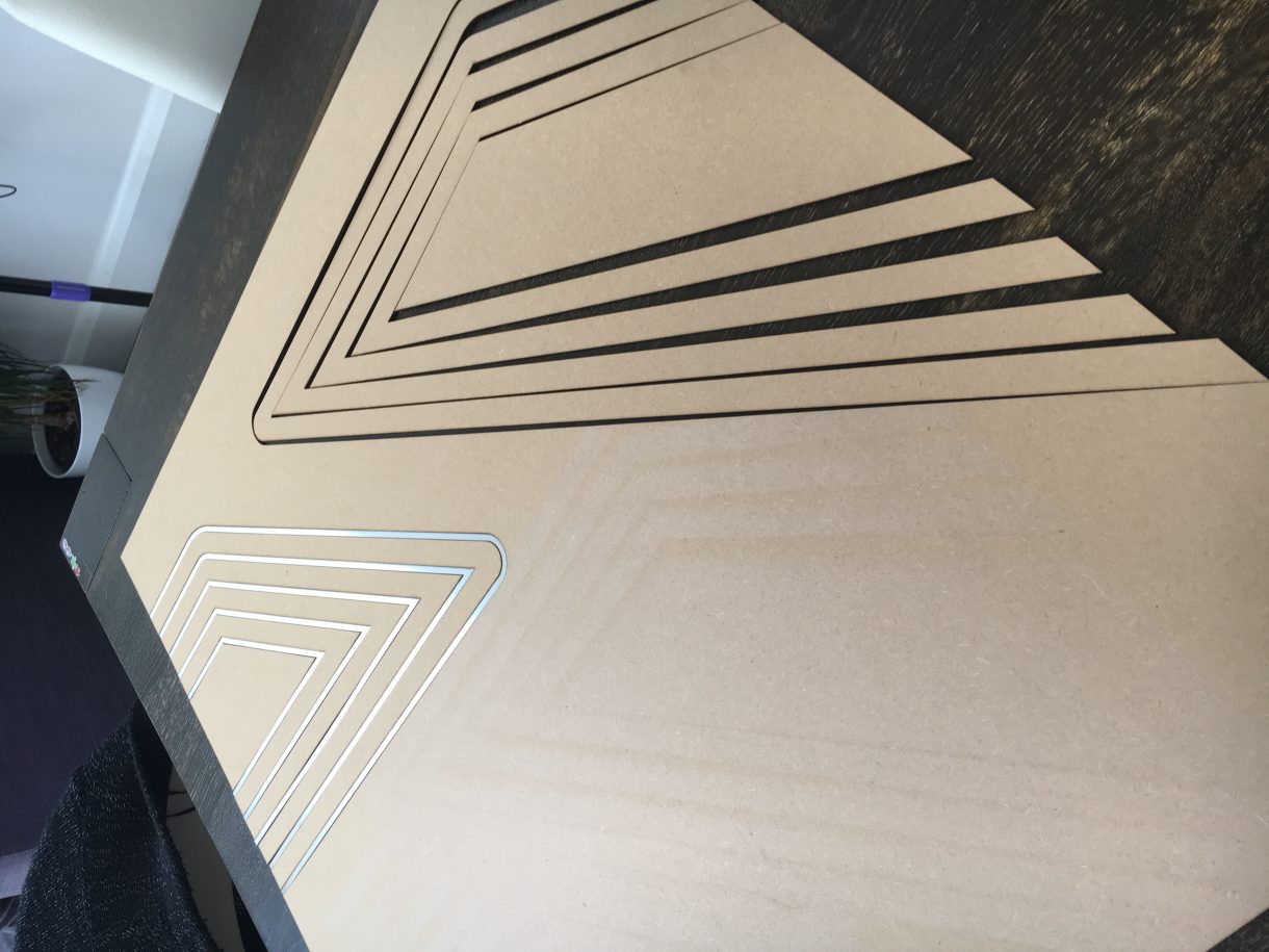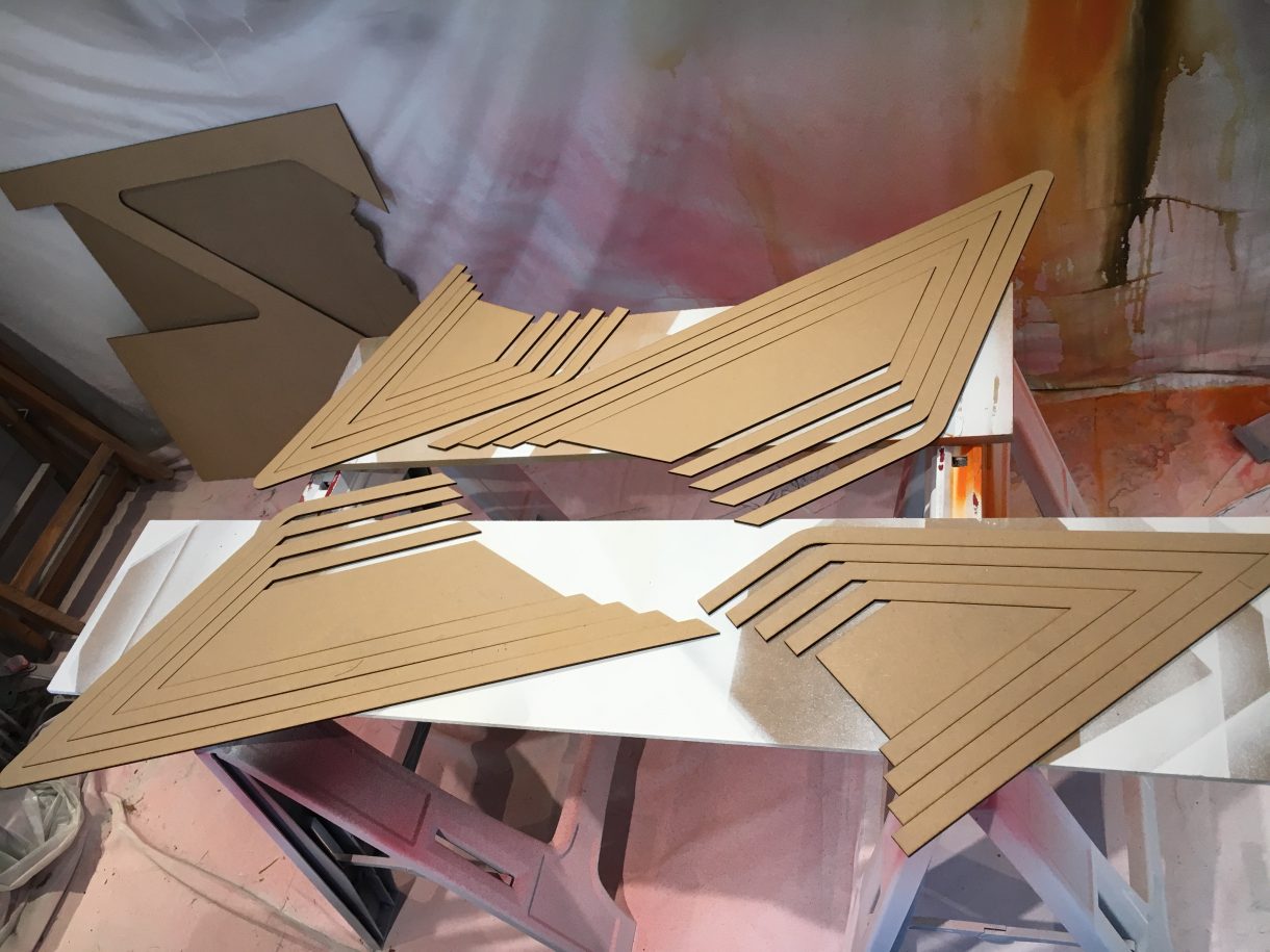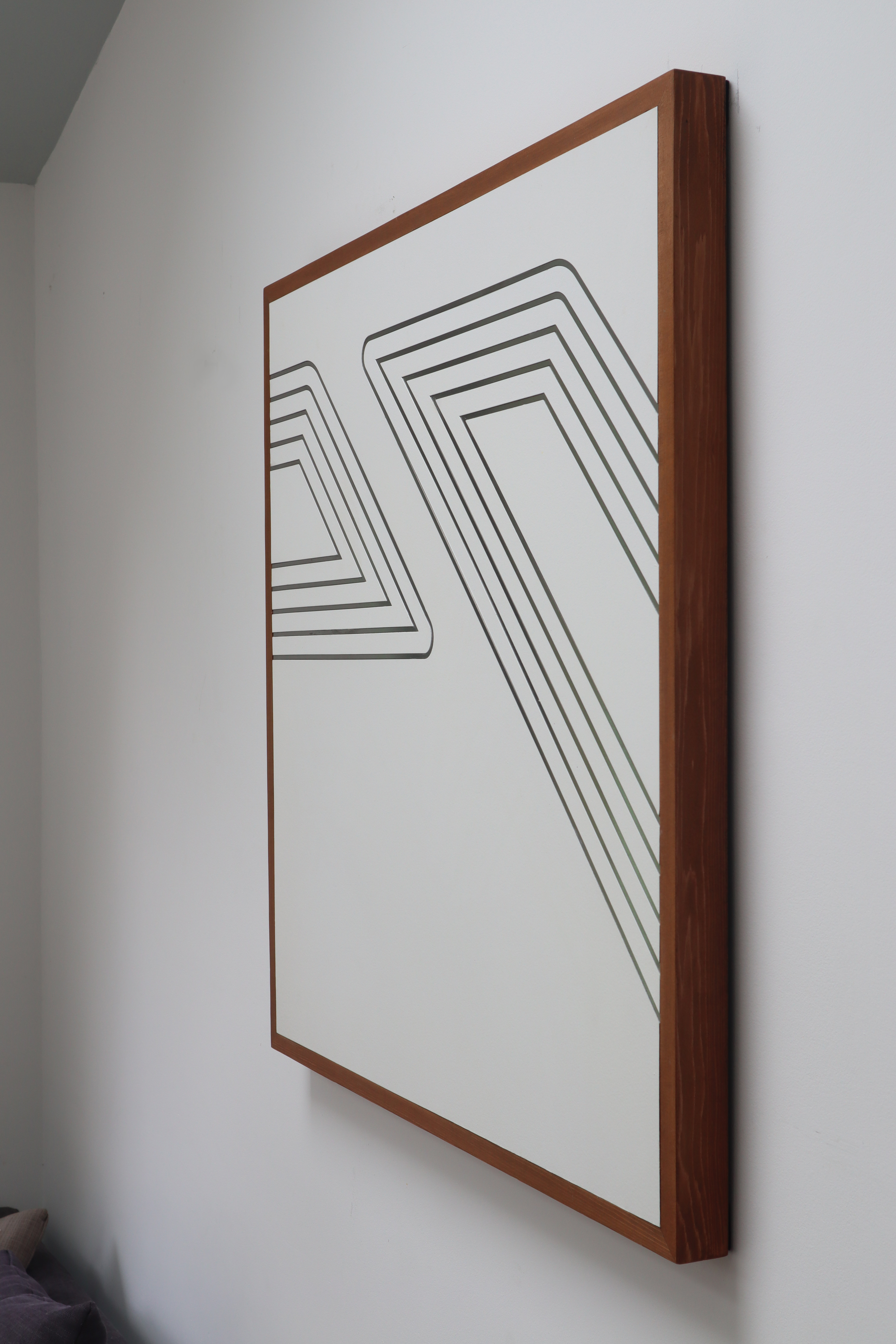 This is an abstract piece designed on computer and then laser-cut in stainless-steel and 3mm MDF. The pieces are then HVLP sprayed for a smooth finish. The frame is cedar wood which has been Waxed with amber tinted OSMO Oil.