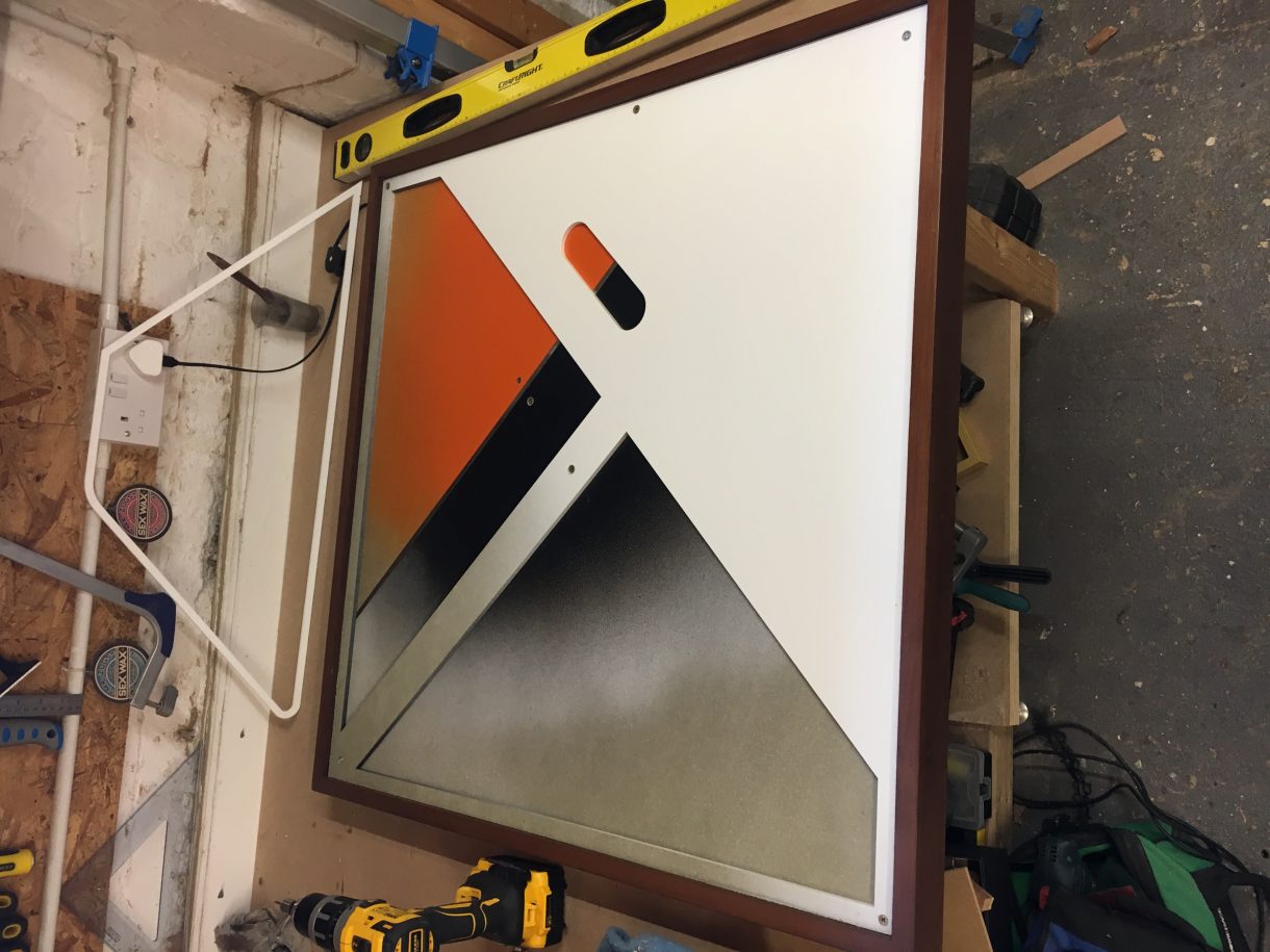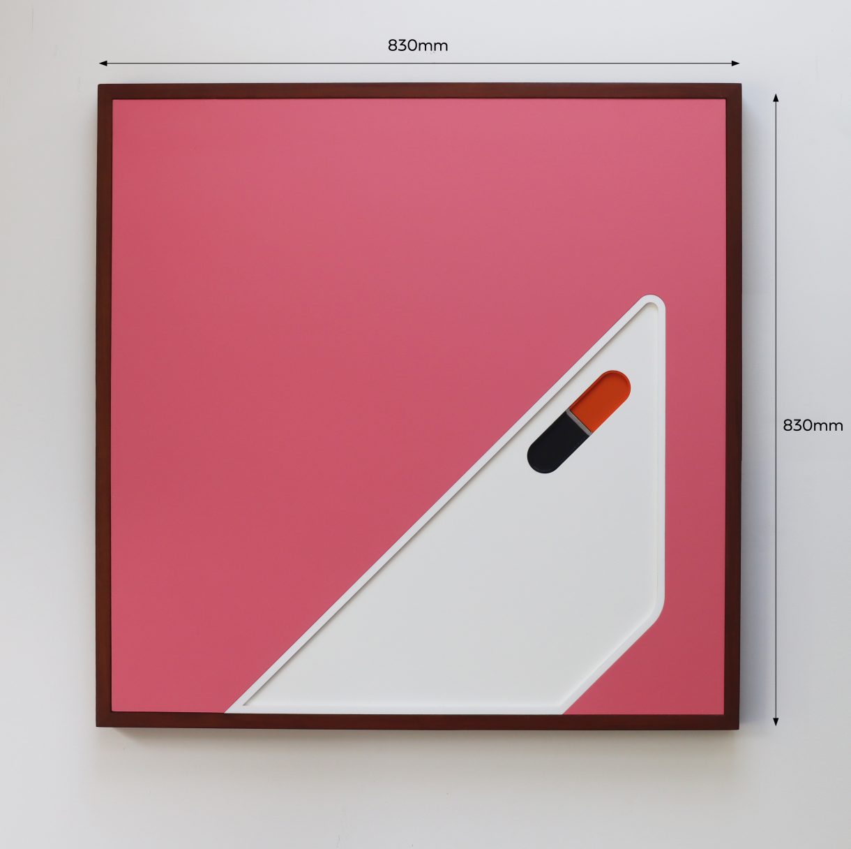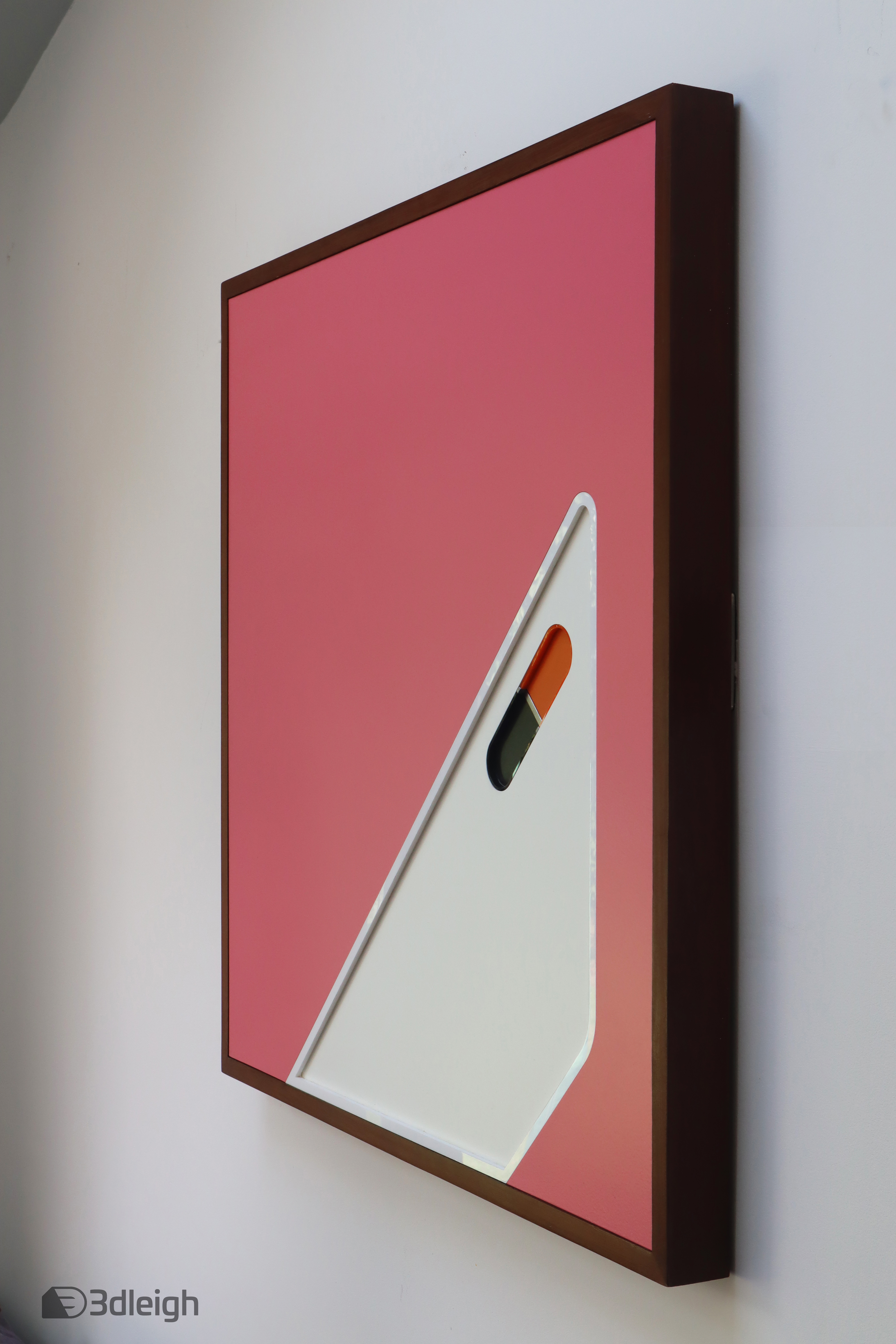 ‘The Magic Pill’ is an abstract piece designed on computer and then laser-cut in stainless-steel, acrylic and 6mm MDF. The MDF is then HVLP sprayed for a smooth finish. The frame is cedar wood which has been Waxed with amber tinted OSMO Oil.